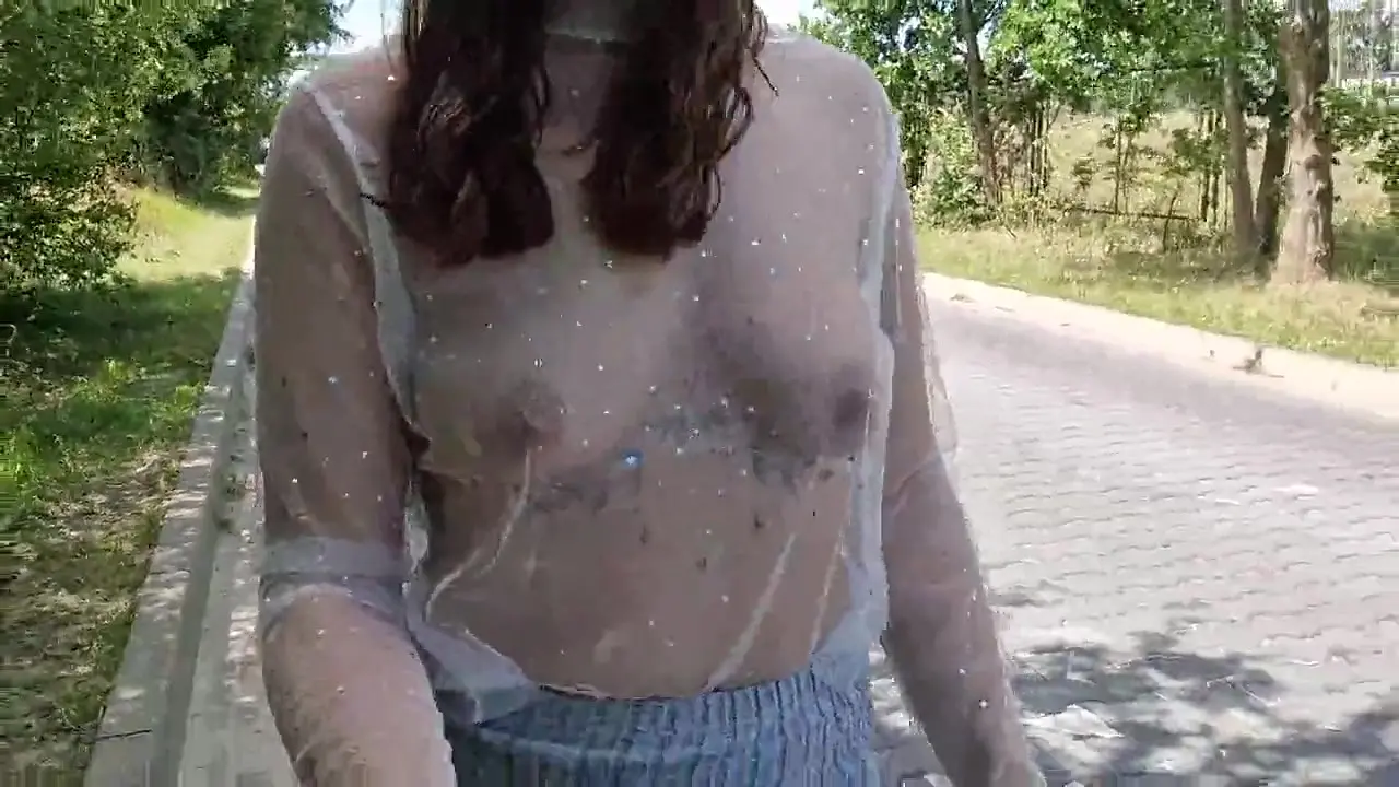A babe walks around the city in a barely-there transparent T-shirt, teasing everyone with her bouncy breasts. She flashes her nipples as she strolls confidently on the busy streets. Onlookers can't help but stare at her sexy display.