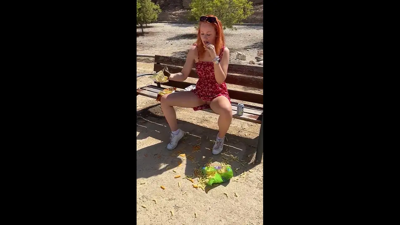 Smoking a cigarette in the park, this sexy ginger teen can't resist the urge to trash some fast food. She teases guys with her revealing outfit, flashing her tits while enjoying her picnic. She smokes on her food and even shows them her pussy before finishing her cigarette.