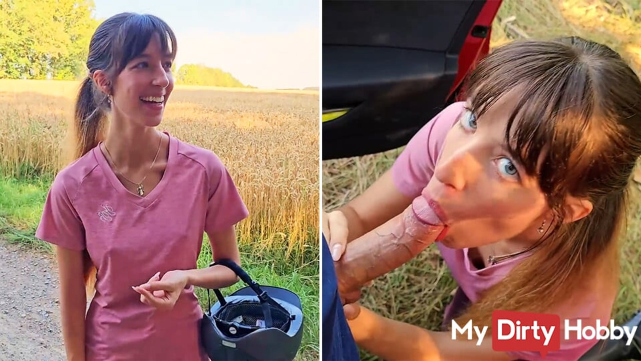 German beauty blows cock outdoors in nature