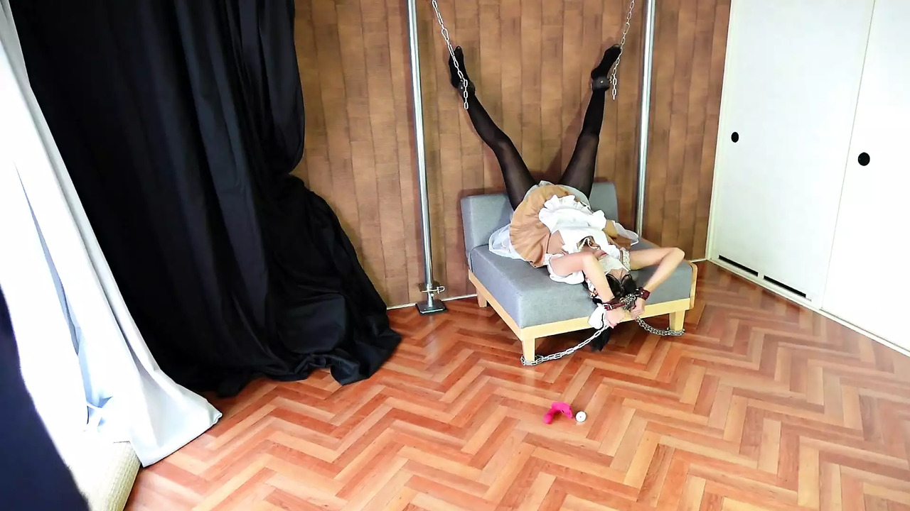 A busty maid is tied upside down to a pole in public, her legs spread wide open for all to see. She's being trained and teased with a vibrating toy, making her moan as she's on display. The crowd watches as she takes the punishment and pleasure.