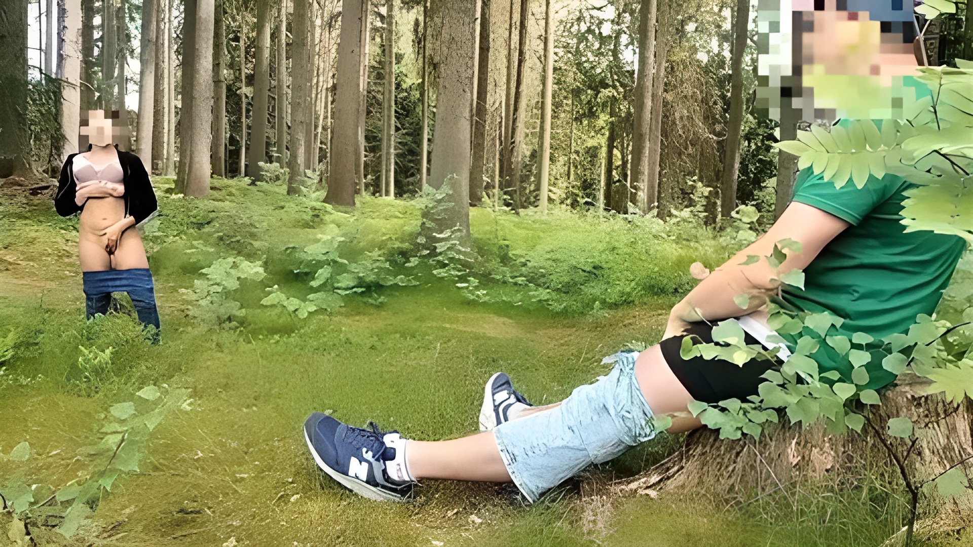 Man flashes in the woods — woman watches and touches herself He joins — sucks — and I shoot on her chest