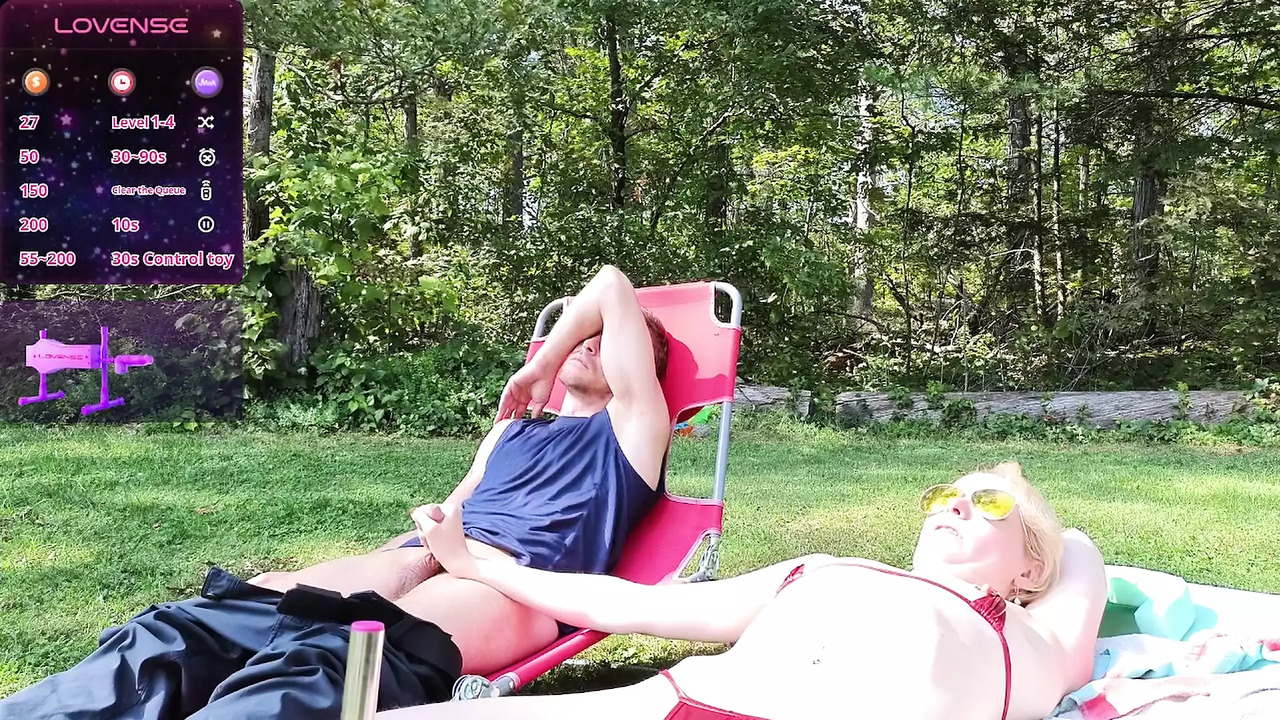 Sexy amateur MILF wife enjoys herself in the sun as she enjoys fucked by a machine and a guy, giving a handjob to another. She squirts a creamy load from her pussy.