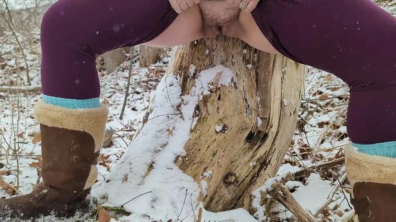 Winter Wood Trail: Girl pees up against a tree