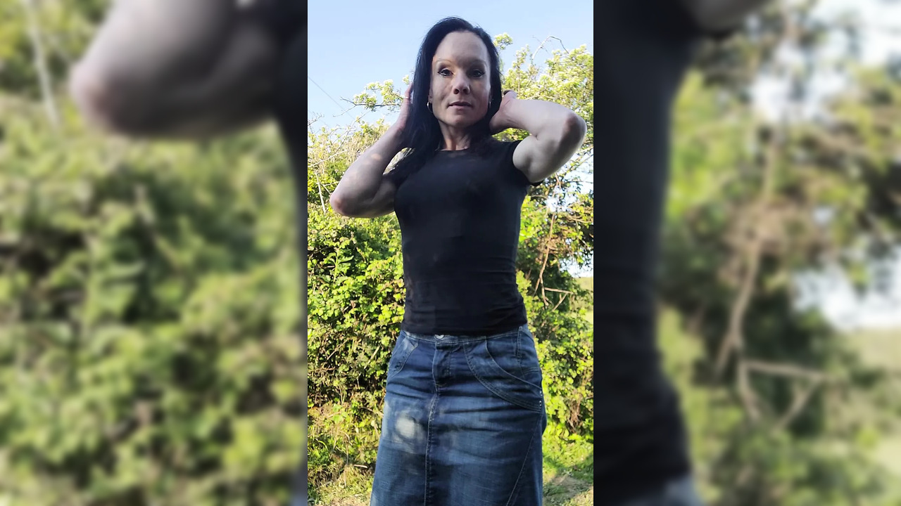Sunshine - slutty tattooed girl squirts in public from countryside pussy play
