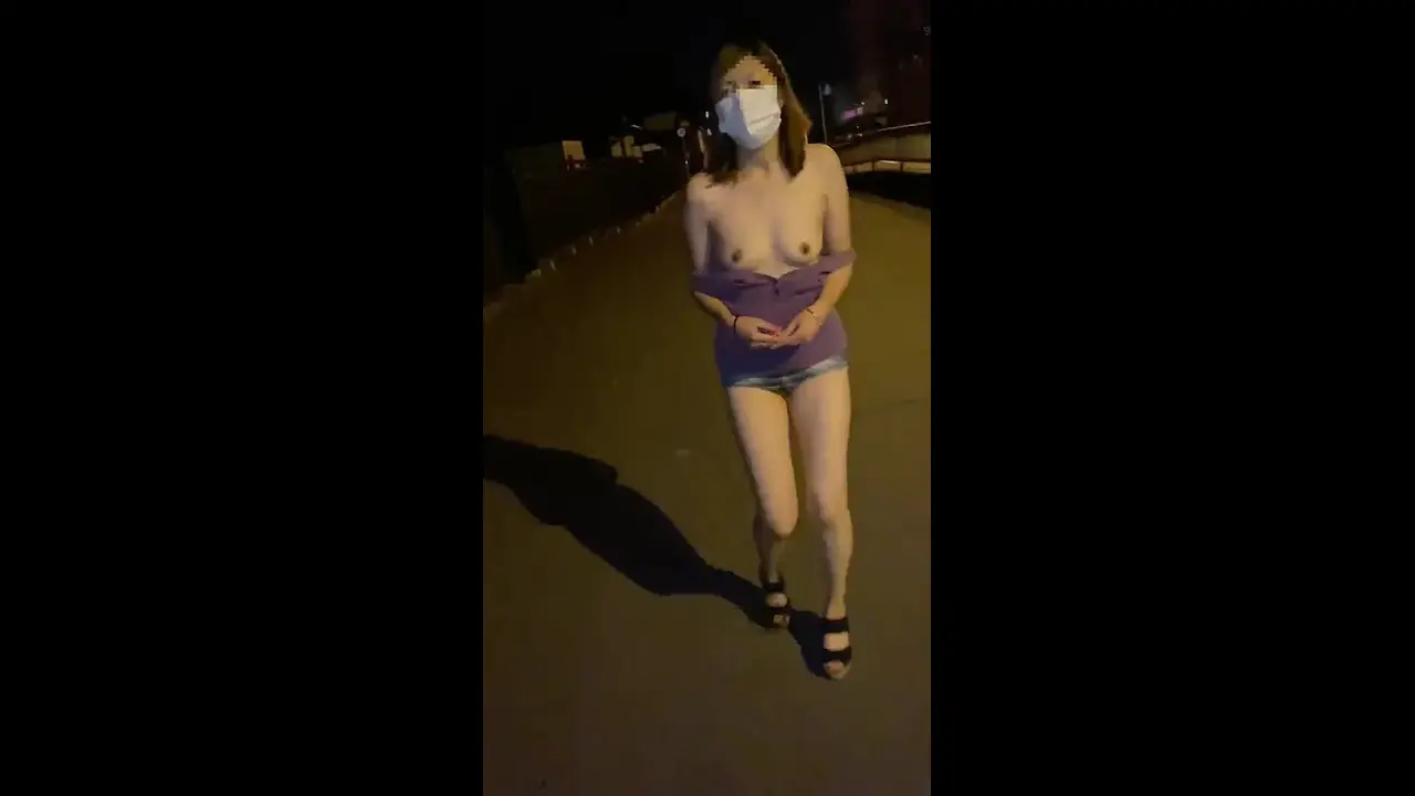 Flashing her boobs in a mini skirt, Japanese wife's open air exhibitionism