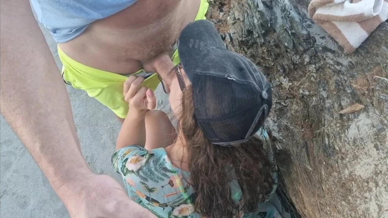 blowjob on public beach and cumshot on tits