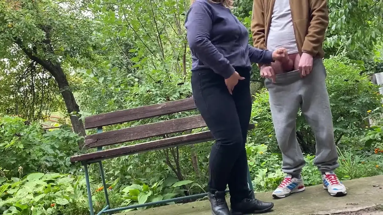 Curvy mature mom with big natural tits receives covered in her boyfriend-in-law's cum while they're clothed in a public outdoor setting. She enjoys the messy hand job and doesn't mind that it's not her son. Both are very chubby and hairy, adding to the unique scene.