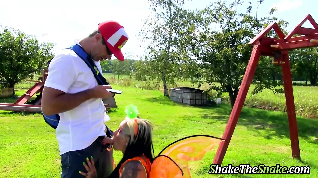 Tattooed Teen Lovely Fuck with Pegasus in Outdoor Door Scene