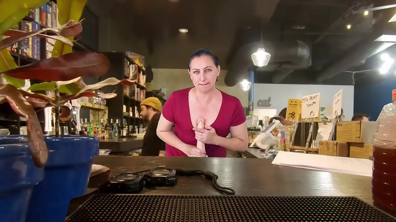 A pretty lady in a red dress gets down and dirty, sucking on a big dildo with enthusiasm. She doesn't hesitate to play with her pussy and her tits while doing so. The outdoor setting adds an extra layer of depravity to her sexy display, making her the ultimate slutty pinup goddess.