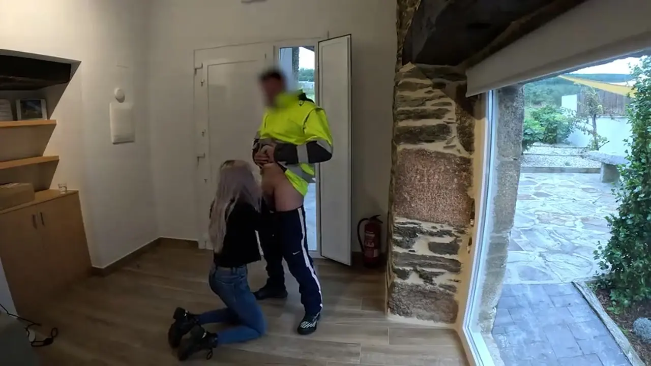 Lonely housewife eagerly opens door for pizza delivery, but instead of food, she's greeted by a handsome stranger. Seizing the opportunity, she pulls him in for a surprise blowjob, making his rod hard. She rides him right there on the doorstep, getting him deep inside her before he cums on her tits.
